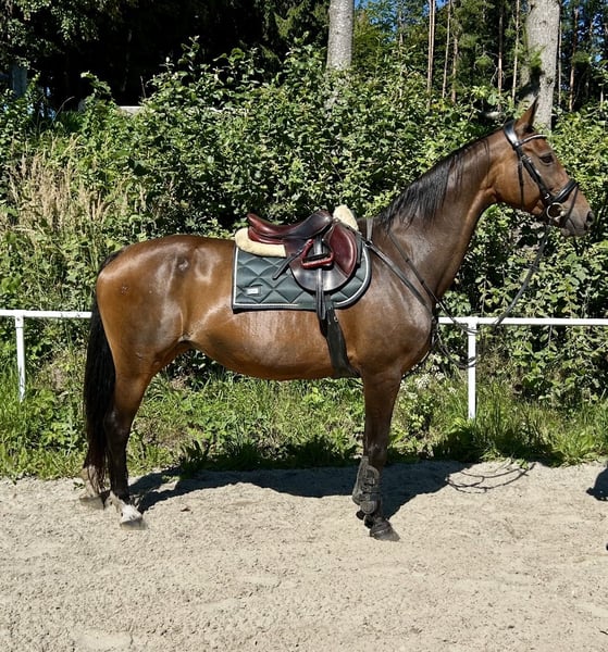 Bambie is an elegant Hanoverian mare, approximately 167 cm tall. Despite her age of 18 years, Bambie is very well-muscled and in great shape. This horse is very easy to ride and always behaves excellently. Whether in dressage, jumping, or trail riding, you can always rely on Bambie. The mare is barefoot and gets along very well with other horses! For more information and videos, feel free to contact via WhatsApp or by phone at: 00436603632373 Location: Pelmberg 15/ OÖ Viewings and test rides are welcome by appointment! Transport of the horse can be arranged!