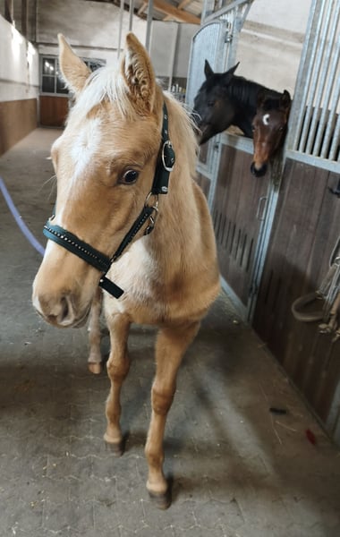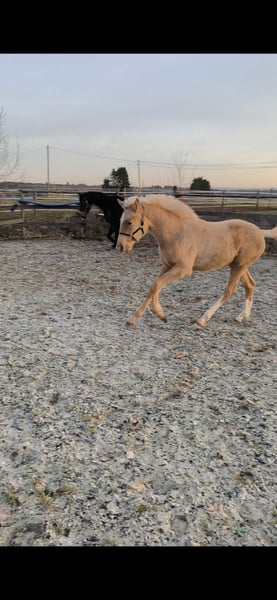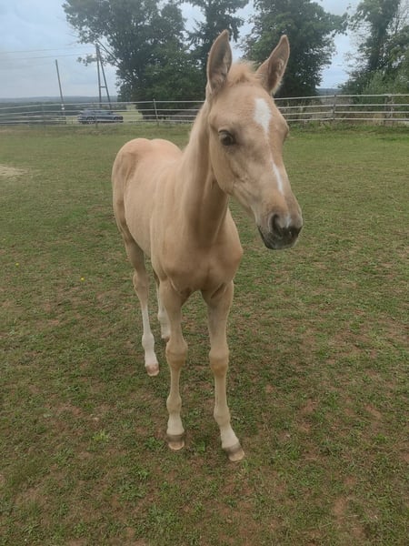 Due to unreliable buyers, she is back on the market. You learn from experience... Because of my pregnancy, I am willing to part with my young sporthorse. This is not a desperate sale! Elsa features a stunning palomino color combined with excellent genetics for show jumping and eventing. She is registered with the SCSL - Studbook du Cheval de Selle Luxembourgeois. She has top lines for jumping and eventing, with strong performance bloodlines and a solid dam line. Her sire is a young stallion from the renowned Muze stud farm. Her dam has shown free jumping in the Hanoverian main studbook, and her grandmother has achieved sport success. Elsa presents as a very correct and brave yearling, with plenty of power in the hindquarters and a harmonious conformation. She is energetic but very friendly. She stands quietly for grooming, tacking, and leading, and is easy to handle when it comes to hoof care, spraying, and touching all over. Very fearless. An ideal sport horse for an ambitious and experienced rider in eventing or show jumping. Her final height should be around 16.1 hh. She has been raised in a premium environment with high-quality feed, regular farrier visits, and daily turnout since birth. She can remain there if a suitable training or sales arrangement is desired. Price is negotiable, and I prioritize the horse’s sporting potential. I am open to significant concessions for qualified riders or trainers.