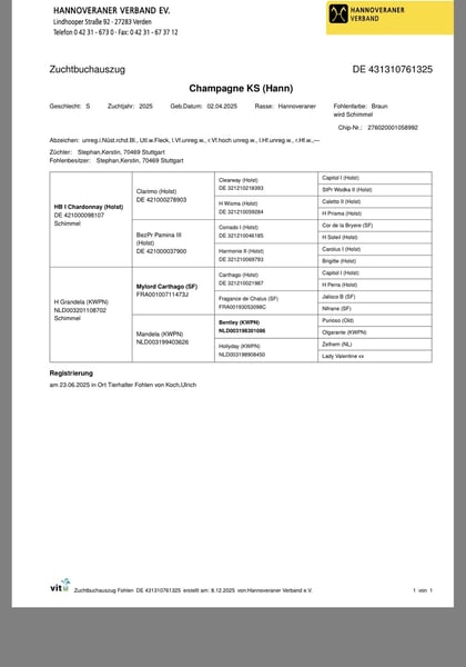Potranca de cría de Chardonnay x Mylord Carthago Chardonnay (hija de Clarimo) fue caballo de la Copa del Mundo con Max Kühner. Premiada con la Medalla de Oro por la Asociación Hannoverana en la feria de potros en Oyten. Desarrollada y criada en condiciones adecuadas, puede permanecer allí incluso después de la venta. Ya sabe ser manejada a la cuerda y se le ha herrado. Aún puede convertirse en alazana.