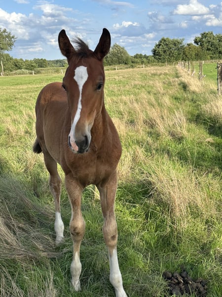 Only You M is a typy, beautifully marked, and likable filly (born on 09.05.2025). Her maternal grandfather is Chacco Blue: already a legend, he made headlines with a 3rd place finish in the Grand Prix of Aachen, showcasing the talents of Chambertin's son. Her sire is Ogano Sitte, by Darco x Avontuur x Major de la Cour: Under rider Dominique Hendrickx, Ogano Sitte achieved international success at 4-star level and won the 1.60 m Grand Prix CSI**** in Naples. His immense fighting spirit and excellent attitude set him apart. His father Darco, who won numerous Grand Prix events and was seventh in the individual standings at the 1992 Olympic Games in Barcelona, has shaped the international show jumping scene with offspring like Sapphire (Mc Lain Ward/USA), Parco (Ludo Philippaerts/BEL), and Winningmood (Luciana Diniz/POR). The suffix "Sitte" traces back to Ogano Sitte's great-grandmother Gute Sitte, a successful Hanoverian daughter of the influential stallion Grande from a pure Thoroughbred mother, who won team bronze at the 1976 Olympic Games in Montreal with Eric Wauters/BEL. The name "Sitte" is synonymous worldwide with exceptional quality in show jumping, toughness, and fighting spirit. Over 80 descendants have made it to the top sport and impress on the international stage. Successful offspring include Arac du Seigneur under Angelique Rüsen (GER), H&M Ikker under the Philippaerts brothers (BEL), Sisley de la Tour Vidal under Pénélope Leprévost (FRA), Aganix du Seigneur under Jos Lansink (BEL), Button Sitte under Richard Moloney (IRL), Viego les Hauts under Victoria Gulliksen (NOR), Gaudi under Paola Amilibia (MEX), Legend under Eduardo Álvarez Aznar (ESP), and Thelma ala Tour Vidal under Koti Sato (JAP). A pedigree that speaks for itself.