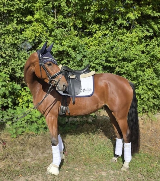 Se vende una yegua de 3 años, sumamente encantadora y talentosa, con una genealogía excepcional en doma clásica: Scolari x Hohenstein x Donnerhall, un pedigrí que combina carácter, presencia y calidad. Actualmente mide aproximadamente 1.60 m y muestra un desarrollo muy armonioso. Es especialmente destacable su paso, tranquilo, suelto y siempre en ritmo. También en el trote impresiona con un buen movimiento, y el galope es hacia adelante y muy potente. La yegua es muy fina en la boca, agradable en la rienda y fácil de montar gracias a su buen asiento. Ha sido montada con suavidad y ya puede ser montada sin problemas por jinetes jóvenes con experiencia. En su manejo diario, se muestra siempre tranquila y sencilla, es respetuosa en el remolque y, sin hallazgos en radiografías, espera su nuevo hogar. Una excelente promesa para jinetes ambiciosos, lista para seguir siendo desarrollada y perfeccionada.