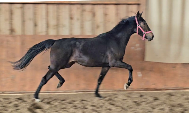 Eine gerade in der Entwicklung stehende elastische, herrlich sich durch den Körper bewegende und mit 3 guten GGA ausgestattete, immer interessierte Stute. Besonders hervorzuheben ist ihr so wertvoll aktives und immer unter den Schwerpunkt fußendes Hinterbein. Der Schritt ist überragend. Viel Raumgriff, immer klar im Takt und schreitend