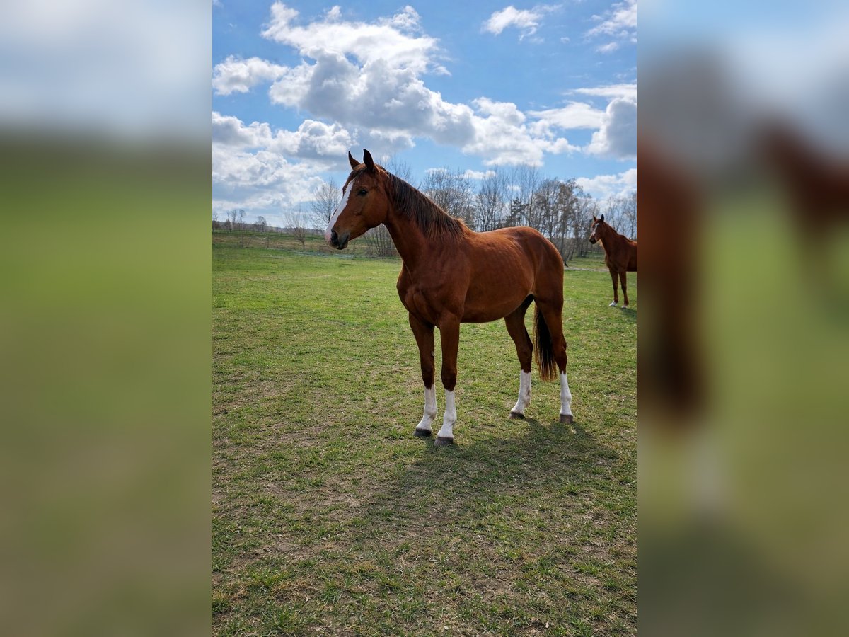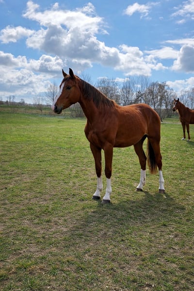 For sale: a promising Hanoverian mare born in 2023. This elegant chestnut mare impresses with her attractive appearance and her potential for eventing. Standing approximately 16.1 hh, she offers the perfect size for ambitious riders seeking a versatile and talented partner. The young Hanoverian mare is already well-schooled in the arena and on the cross-country course, consistently showing attentiveness, eagerness to learn, and a pleasant demeanor. Thanks to her excellent pedigree and balanced temperament, she is ideally suited for development in eventing, whether in dressage, jumping, or cross-country training. She is healthy, regularly dewormed, and vaccinated. Well-socialized and exhibiting a promising basic attitude, she is an excellent choice for riders looking for a talented young mare with great potential for growth and development. Please feel free to contact me for more information or to arrange a viewing.