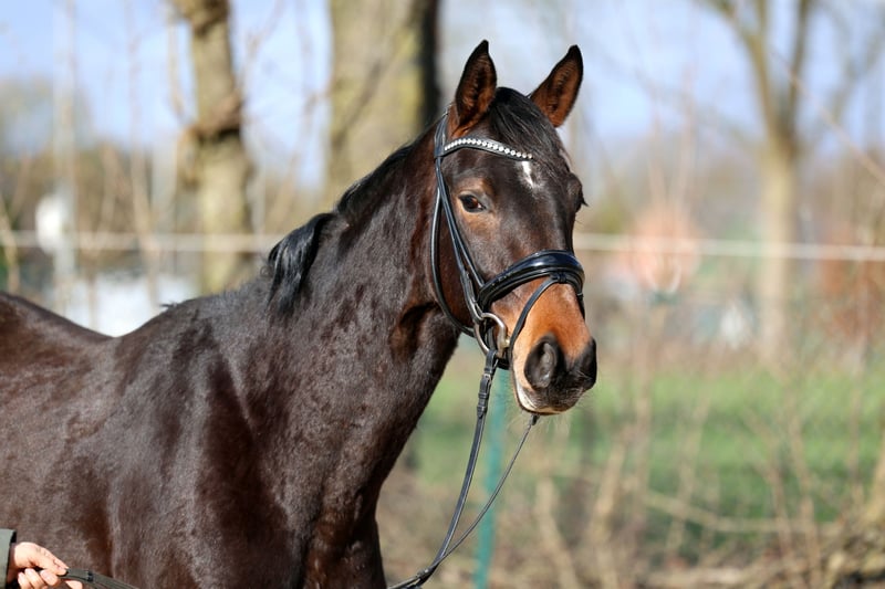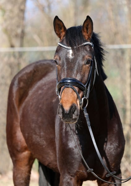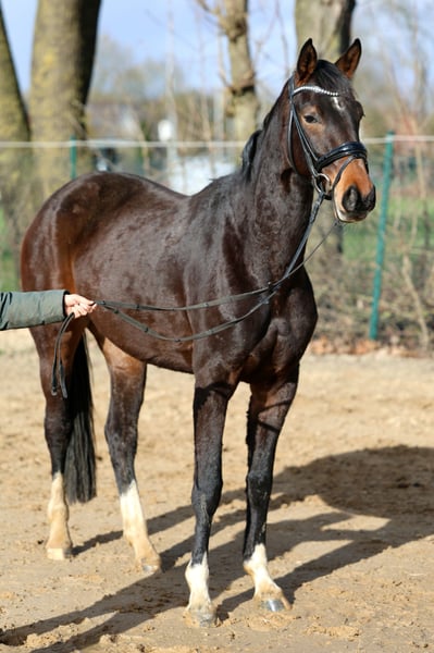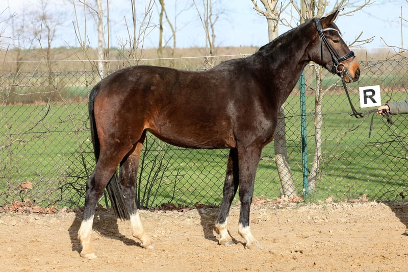 Gerade dreijährig und noch voll entwickelt so präsentiert sich diese junge Nachwuchsstute. Bei ersten Schritten in der Arbeit begeisterte sie durch ihre unkomplizierte und einfache Art. Ein ehrlicher und unerschrockener Charakter bei bester Arbeitseinstellung. Diese Qualität kommt nicht von ungefähr, so stammt Vater Extra Gold aus weltbekannten und so erfolgreichen Linie der Weihegold. Er selbst war gefeierter Siegerhengst der Körung in Münster. Mütterlicherseits folgt der Stamm der Familie Pape aus Hemmoor. Jüngster Erfolgsspross dieser Linie ist Endorphin FRH, Bronze Medaillengewinner auf der weltmeisterlichen Bühne in Verden. Nach seinen Erfolgen auf dem Bundeschampionaten 2023 und 2024, wo er zweimal Vizebundeschampion wurde, knüpft er nun an seine Erfolge an und setzt seine exzellente Laufbahn in den Jungpferdeprüfungen fort. Diese Linie brachte neben zahlreichen internationalen Sportpferden mit dem gekörten Regazzoni und Donnerwerther auch einen deutschen Vizebundeschampion und einen englischen Bundeschampion hervor. Video auf Anfrage. Im Züchterauftrag wegen Bestandsreduzierung. Gute Röntgenbilder liegen vor.