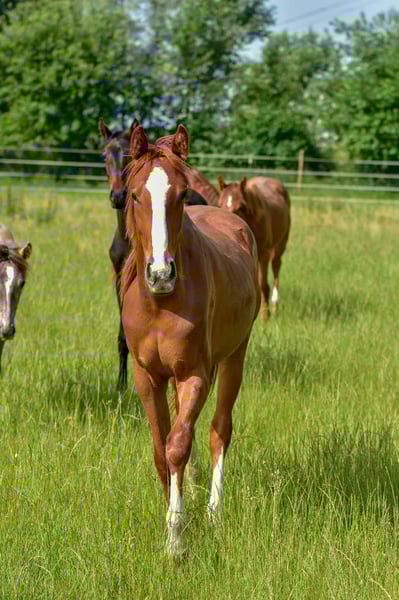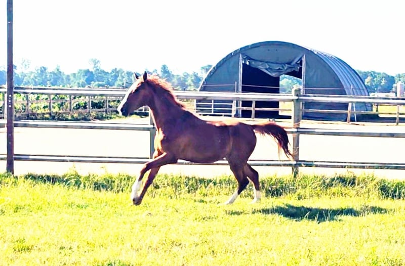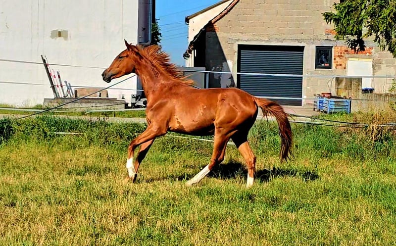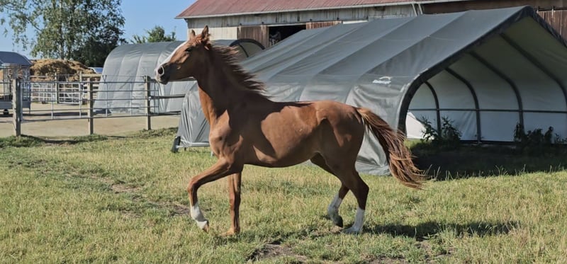 We are looking for a new home for a very special, two-year-old, untrained mare with the potential for ambitious, athletic development for big tasks and higher demands! - **Breed:** Hanoverian - **Gender:** Mare - **Year of Birth:** 2023 - **Color:** Colorful chestnut - **Height:** 172 cm - **Suitability:** Eventing, Dressage, Show Jumping - **Training Level:** Untrained This talented, energetic young mare impresses not only with her attractive appearance, her distinctive head, and her enormous power but also with her unique character and strong will. She is ideally suited for eventing and already shows promising approaches in both dressage and show jumping. Like one would expect from a young and blooded horse, she has a lot of go and an iron will. She is not easily manipulated and enjoys challenging her human. She likes to test whether our will is at least as strong as her own and whether it is worth it for her to commit to her human. Like a wild child. However, once you have convinced her, she will be on your side forever. She does not follow just anyone and certainly not under pressure. One must be smarter than she is and know exactly what they are doing and wanting. The person whom this strong-willed mare follows should consider themselves lucky to have a true warrior by their side, one who would go to great lengths for their human if necessary... The mare is well-socialized, lives in a mixed-age herd of mares, and is therefore accustomed to interacting with other horses. She is dominant, rather high-ranking, but knows how to subordinate herself as well. She is not a bully but does not allow herself to be pushed around either. She does not provoke conflict but does not shy away from it either. She has incredible endurance and is ready to grow together with her new, own human. She will become a true, demanding sport horse, so we do not see her as suitable for weak or inexperienced riders. She has enormous strength and more than enough frame and caliber, making her also well-suited as a horse for men. If you are interested or would like more information, we look forward to your message.