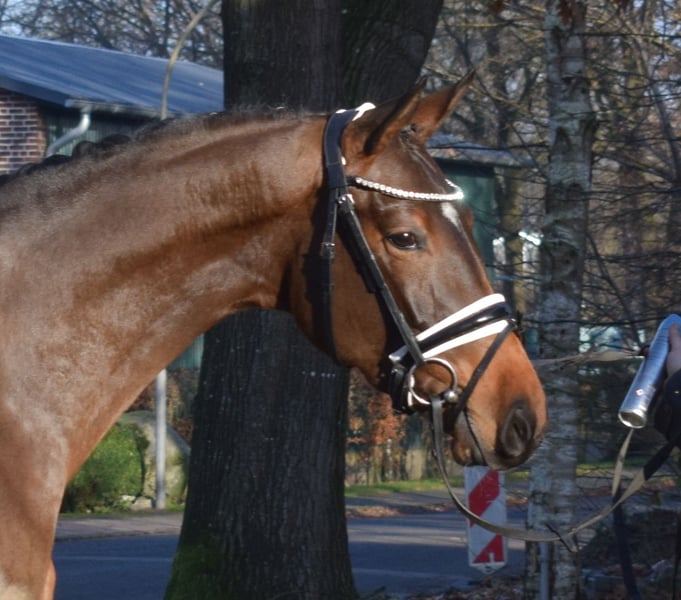 A dancer you rarely come across! This beautiful, expressive mare features a very expressive, ground-covering walk, an uphill canter and trot with highly active hind legs and a willingness to collect. Vajana has an excellent temperament and is very easy to ride and eager to learn. She is a horse that adapts wonderfully to training. She is perfectly suited for both demanding dressage competitions and amateur riders. She is well-trained for her age and ready for her first show appearances in riding horse tests and dressage horse classes -A-. Vajana is ridden both indoors and outdoors and consistently shows herself to be very straightforward and calm in both environments. She currently measures 164 cm at the withers and is still growing. Thanks to her very correct conformation and well-set neck, she appears larger under the rider and comfortably carries taller riders as well. Trial rides are available at any time by arrangement. More information can be found on our homepage. Hof Heisterbusch Team.