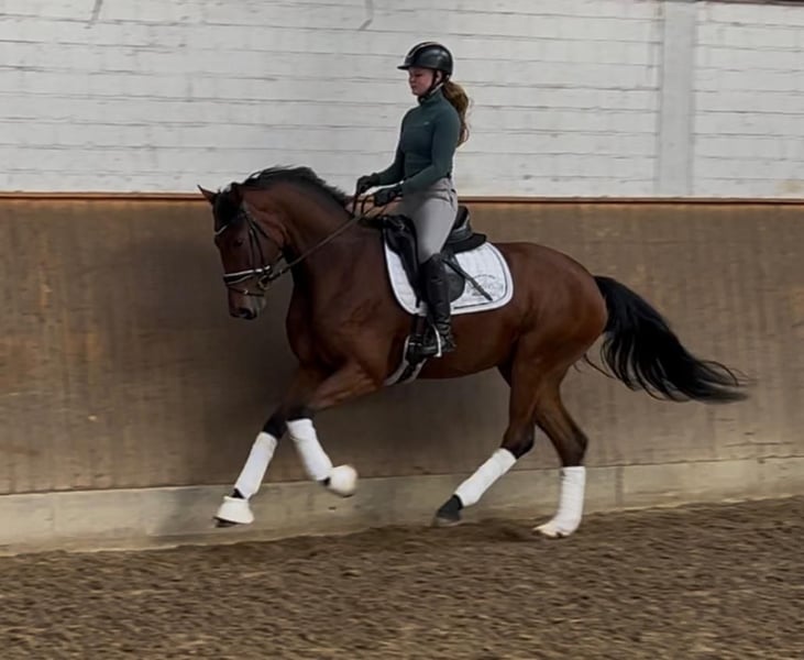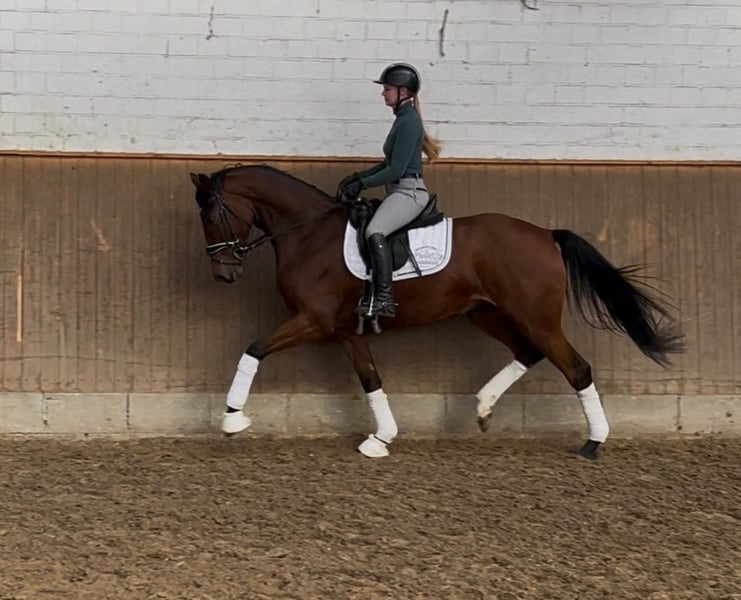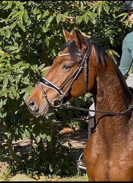 **Sales Advertisement: Beautiful Hanoverian Mare** For sale is a talented Hanoverian mare, born in 2021. With her elegant brown coat and a height of 167 cm, she is not only a real eye-catcher but also a promising dressage talent. This mare impresses with her excellent movements and remarkable rideability. She shows great potential in dressage and is suitable for both ambitious riders and those starting in the competition sport. The mare is well-mannered, well-trained, and has a friendly character. She is safe and reliable both in the field and in the arena. If you are interested or would like more information, please feel free to contact me. Visit us and see for yourself this extraordinary mare! She has been presented in riding horse tests three times and has placed each time, including two second places.