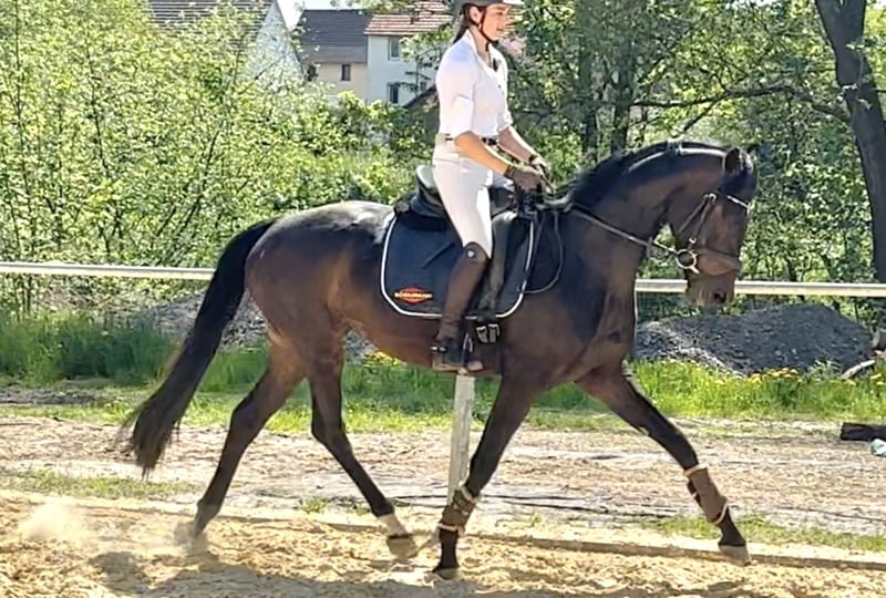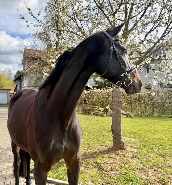 Sehr edel, 3 überdurchschnittliche GGA, feinfühlig mit wenig Druck zu reiten, mutig für Reiterin, die sie in aller Ruhe schön fördert Direkt vom Züchter, 4 j. schonend von junger Reiterin angeritten, aktuell auch Training über Cavalettis und demnächst geht es auch ins Gelände Mutter S-Line ist Vollschwester zu 4 *S Grand Prix Stute Schöne Scarlett, die über viele Jahre hocherfolgreich mit Helen Langehanenberg war. Aus der Londonderry-Mutter stammt auch das Elitepferd S* Divino Negro, weitere Erfolgspferde aus dem Stamm.