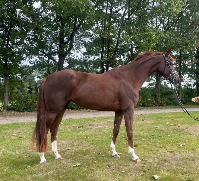 For sale: Hanoverian mare – dark chestnut, born in 2021 We are offering an elegant and talented Hanoverian mare, born in 2021. Standing at 16.1 hh, she combines size and grace perfectly. Her stunning dark chestnut coat makes her an exceptionally beautiful mare. Elegant, stylish, gentle, and easy to ride, she comes from our own breeding program. Her strength lies in dressage, and she has an exceptionally kind temperament when ridden. A loving mare that the rider can rely on. An ideal partner for competitive dressage, leisure riding, and also suitable for trail riding, as she remains calm and friendly in the terrain. If interested, I am happy to provide further information and arrange a viewing.