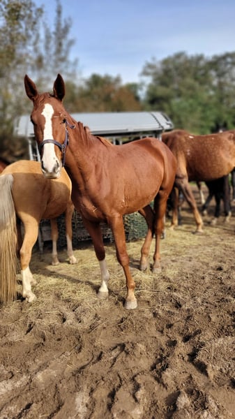 Jument alezane Damaschina par l'étalon primé et champion d'Allemagne Damaschino par Donnergirl.par DonquestadorxJaquarexRubinstein né le 11.05.2021. Préf. Stm. 172. Damaschina peut maintenant être débourrée. Elle dispose d'un physique correct et d'allures supérieures à la moyenne. Il faut souligner son très bon pas ample qu'elle a hérité de son père Damaschino par Danone (Donnerhall-Weltmeyer) - Fidertanz Caprimond. Damaschino a été en 2019 champion d'Allemagne des étalons de 3 ans, en 2020 vice-champion d'Allemagne des étalons de 4 ans avec une note finale de 9,4. Excellente première année de poulains avec un pic de prix de 70 000 euros et un prix moyen de 19500 euros. En 2021, Damaschino s'est classé 6ème de la finale des championnats du monde. Sa mère Donnergirl a passé un bon test de performance de jument. Les descendants de Donnergirl font tous de la compétition en fonction de leur âge. Son petit-fils Bombay Royal a été admis au Bundeschampionat à l'âge de 4 ans. Damaschina a donc toutes les qualités requises pour le grand rectangle et son pedigree est également très intéressant du point de vue de l'élevage.
