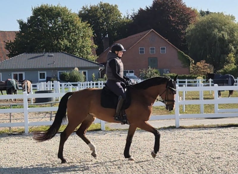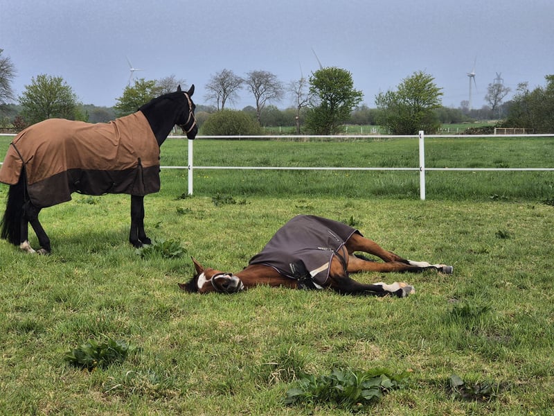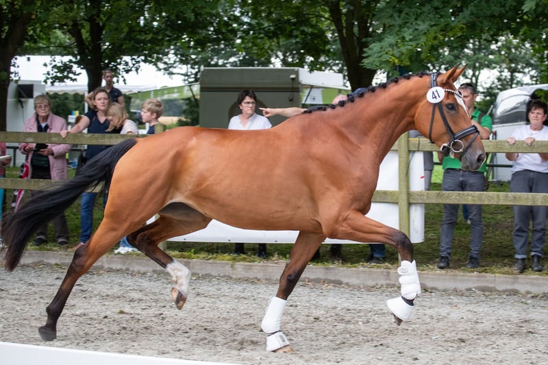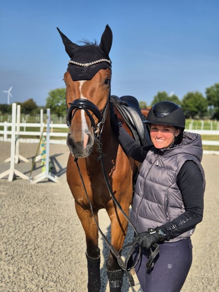 Zum Verkauf steht unsere 5 Jährige Hannoveraner Stute Zayla. Sie ist noch in Züchterhand und wird in nur liebevolle Hände verkauft. Sie stammt ab von Zackerey - Detroit - Fürst Heinrich - Feinbrand - Vollkorn xx. Sie ist etwa 1,76 m groß, weshalb sie viel Zeit zum reifen bekommen hat. Zayla ist brav im Umgang, lässt sich problemlos überall anbinden und fertig machen. Sie war immer regelmäßig beim Schmied. Aktuell läuft sie auf 4 Eisen, weil sie recht viel auf hartem Boden läuft. Sie ist brav beim ausschneiden und beschlagen. Zayla ist auf einem soliden Ausbildungsniveau, kennt Halle, Platz und Gelände. Dabei macht es keinen Unterschied ob man mit ihr allein arbeitet oder andere Pferde dabei sind. Sie geht auch allein ins Gelände, ich persönlich bin aber lieber mit anderen unterwegs, so dass das noch nicht oft vorkam. Sie ist entspannt und gelassen im Gelände. Hier hat man sehr viel Freude mit ihr, und sie gibt ihrem Reiter ein sicheres Gefühl!! Sie ist für ihr junges Alter relativ abgeklärt, kann sich aber natürlich altersentsprechend trotzdem mal erschrecken, bockt oder steigt allerdings nicht. Sie kennt auch Hunde in allen Größen. Unsere kleiner quirliger Mini-Aussie ist oft dabei und flitzt von hinten oder vorne an ihr vorbei, das stört sie gar nicht. Auch von Maschinen wie Treckern oder Hoflader nimmt sie kaum Notiz. Zayla lässt sich problemlos ohne weitere Hilfsperson verladen und gut fahren. Alleine abladen, am Hänger anbinden und fertig machen, sind gar kein Problem. Ablongieren in fremder Umgebung, nicht nötig. Aufgrund ihrer guten Grundgangartenqualität mit stets aktiv abfussendem Hinterbein hat Zayla die Anwartschaft zur Hannoveraner Prämienstute verliehen bekommen und könnte somit auch gut in der Zucht eingesetzt werden. Zayla kennt es allein oder in einer Herde Raus zu gehen. Dabei ist sie eher rangniedrig und gut verträglich. Wir wünschen uns für Zayla einen Reiter, der sie behutsam weiter fördert, aber genauso viel Freude daran hat, mit ihr die Seele im Gelände baumeln zu lassen. Auf Grund ihres Alters und Ihrer Größe ist Zayla kein reines Anfängerpferd, auch wenn sie artig ist. Da sie viel Zeit bekommen hat zu wachsen, ist sie noch nicht allzu weit gefördert. Sie ist noch nicht immer stabil in der Anlehung und man merkt, dass sie mit ihrem großen Körper noch nicht immer zurecht kommt. Zayla war bis auf einen Infekt bisher nie krank und auch nie Lahm. Selbst wenn sie mal eine kleine Macke hat, ist sie sehr unempfindlich. Zayla ist in einer gemischten (verschiedene Altersklassen) Herde aufgewachsen und hatte dabei täglich etwa 10-12 Stunden Weidegang. In der verbleibenden zeit hatte sie permanent Zugang zu Raufutter. Guter TÜV inkl. Rücken und Hals liegt vor. Haben wir Euer Interesse geweckt? Möchtet Ihr Zayla kennenlernen? Dann meldet euch gern hier oder via WhatsApp