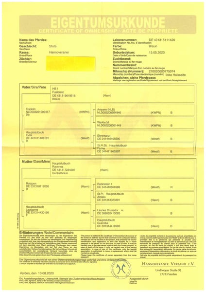 Ofrecemos esta yegua de 6 años (aún sin nombre) porque no queremos ampliar nuestro stock de yeguas. Es una yegua dócil tanto en el establo como en el paddock, incluso en grupo, aunque no tiene mucha experiencia adicional. Es cruda (sin montar y solo ha sido longeada unas pocas veces). Sin embargo, es manejable con cabestro, es tolerante con la herradura y se deja cargar en remolque. Se debe introducir a nuevas tareas de manera pausada y con paciencia. Es posible su uso en reproducción. La yegua nunca ha sido exhibida públicamente. La vemos como una excelente compañera para actividades de ocio, aunque debe mantenerse en compañía. No se dispone de un examen de salud (AKU).
