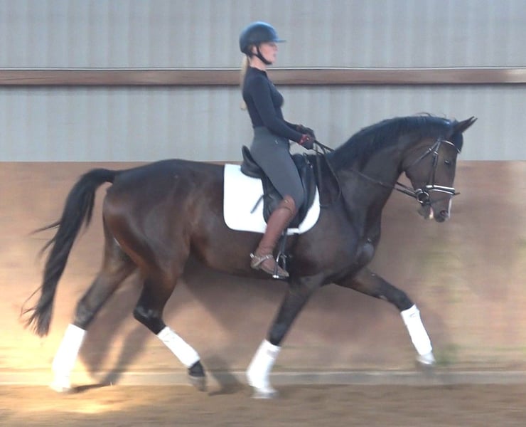 Quilena is a full sister to the Hanoverian approved stallion Quintessential, who became the winner of the 2-day performance test with an outstanding score of 8.94 (gallop 9.7). At three years old, he was vice-champion of the regional championships and was nominated for the Federal Championship of three-year-old stallions. She is a strikingly beautiful and elegant mare, and when she moves, she captures everyone's attention with her powerful, energetic, yet light-footed movement. She moves confidently at an advanced level, already mastering most L-level dressage movements, and as the difficulty increases, her ambition seems to grow. She wants to please, and we wish her a rider who can give her confidence. A very good radiological examination, including neck and back, is available. Quilena has an excellent pedigree: her sire, Q-Sieben, was the dressage winner at his three-year-old performance test with a score of 8.71 and a 9.5 for rideability, and he was vice-champion. On her dam’s side, Quilena descends from an old Hanoverian mare line dating back to 1883, which has produced numerous high-priced elite auction foals and horses. This line includes winners at the Hanoverian Verband and several licensed stallions such as Edinburgh and the successful St. Georg-level performer Weltgraf II. The line also features the successful Laudabilis, with numerous approved sons, and traces back to the old mare line from 1883 through her sister to the third dam. Quilena is a mare of honest character, with outstanding movements in all three basic gaits, and she aims high, promising a bright future in a successful dressage career.