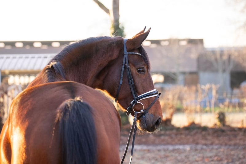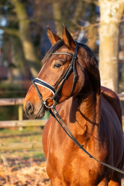 "Flavia" is a beautiful bay Hanoverian mare, born in 2020. Standing at an impressive 17.6 hands, she combines size, elegance, and strength. She is ideally suited for dressage and has shown herself to be talented and eager to perform. Having had two foals, she has been gently backed since autumn. A horse with great potential is waiting for a dedicated rider!
