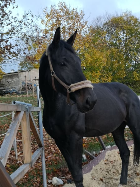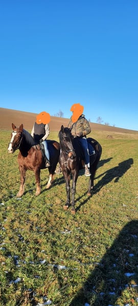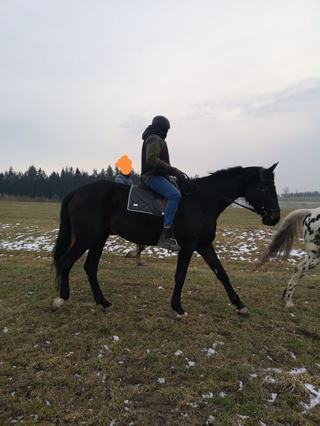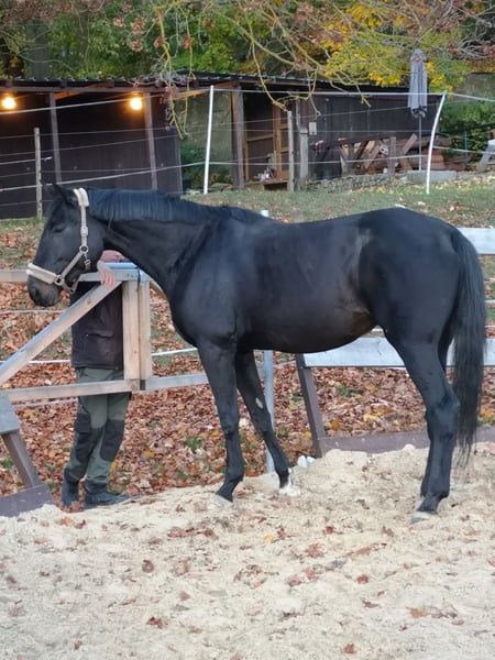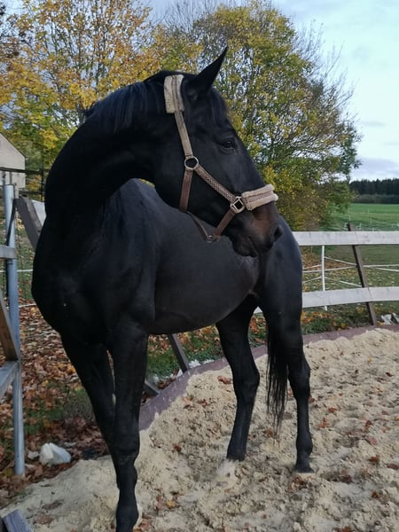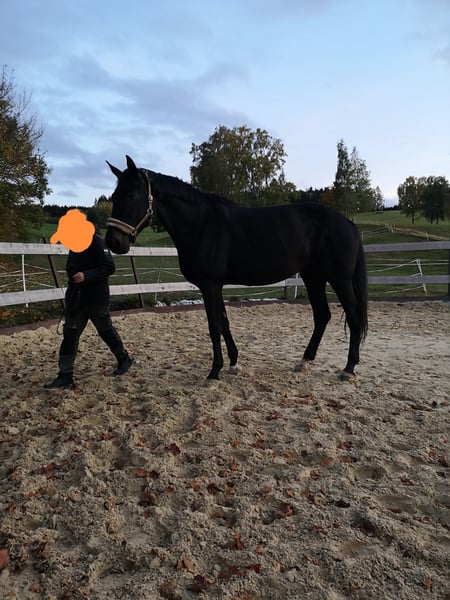 We are selling our 6-year-old Hanoverian mare, Stefanie, by Secret out of Lauries Crusador xx. Due to limited time, we have decided to find her a new home. She is a tall, well-built mare with an approximate height of 16.1 hands. Despite her size, she is pleasant to ride and generally suitable for riders with less technical experience. We purchased her a year ago from her breeder, where she was started under saddle and trained in dressage. She was kept in box stalls with regular turnout in paddocks. Currently, she is housed in an open stable in a mare herd, where she ranks in the middle and is socially compatible. Since she is somewhat prone to weight gain, we currently separate her for a few hours. As a young horse, she unfortunately fractured a piece of her hip socket, which does not affect her daily movement. However, this injury likely makes her unsuitable for the highest dressage classes. For those who do not have grand ambitions for top-level competition and are looking for a nice riding horse, she will surely bring joy. She has expressive gaits and plenty of go, yet remains very rideable and well-behaved. We have also taken her out on group rides in the terrain a few times. She has shown no fear, but still requires a confident rider and a secure horse ahead. Unfortunately, we have too little time for her, as she needs regular exercise to maintain her musculature. She is not currently in intensive training, but a trial ride can be arranged at our round pen for serious inquiries. Due to her pedigree, she could also be interesting for breeding purposes. Further details available upon request.