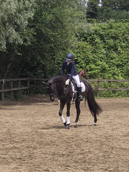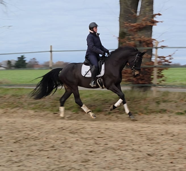 Femme Fatale V. Feinrich • Stute • 1,66 m • keine (stabilen) Mängel • korrekte Haltung • im Besitz des Züchter Femme ist eine wunderschöne Stute, die sich unter dem Sattel gut und zuverlässig handhaben lässt und einen kraftvollen Galopp besitzt. Sie wurde in der Vergangenheit auch viel im Wald geritten. Sie nahm mit uns an einem Übungsturnier teil und gewann die L-Klasse mit hervorragenden Noten. Wir würden sie gerne bei einem erfahrenen Reiter sehen. Video auf Anfrage