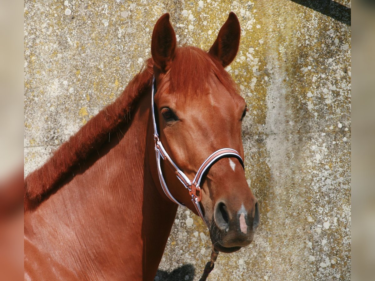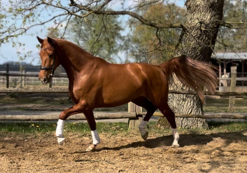 Pretty charming chestnut mare with a lot of charm and expression! 6 years old, born in 2019, 1.72 cm tall. Floriscount / Worldly - De Niro - Western Star - Grande The mare is being sold well below her value due to a finding and therefore will not be sold as a riding horse. Hence the price. This is not an urgent sale!! She could certainly do well in front of a carriage, continue with groundwork, lunging, circus lessons for horses, or be interesting for breeding. Whether she could ever be rideable, I cannot say, so I exclude this in the sale!! Very attractive, charming, lovable, and affectionate mare with spirit, presence, and that certain something is looking for a loving 5-star home. The mare was raised by me and carefully brought up with a lot of love and understanding. She has lacked nothing. She has always been well mineralized and fed, with very good roughage available at all times. From the beginning, her hooves were regularly attended to, her teeth checked and done every year, and osteopathic treatments were carried out regularly when needed. She always had plenty of turnout on large areas, could stay with her mother for a year, and was weaned with a lot of sensitivity. She is lovable to handle and can be led, groomed, and tied up by anyone. She knows and likes water and being hosed down, loves children, dogs, and cats very much, and is also easy to lead and hold in the terrain with a halter and rope. She is well acquainted with a riding saddle and lunging girth, and there are no issues with that. She is worked with regularly. The riding arena with mirrors and outdoor areas right next to a busy road is also no problem. She is road-safe (tractors, trucks, motorcycles, cars with trailers) – all no problem. Farrier, veterinarian, and trailer loading are also no problem. She is familiar with groundwork, desensitization training, double lunging, jumping work on the lunge, or free jumping and does everything well. She is very intelligent, sensitive, and learns incredibly quickly. She wants to please and enjoys working with people. She is never stubborn or unwilling. She is always curious and open to new experiences. She is familiar with box stalls, paddocks, open stable housing, and 24-hour turnout in a mixed herd – all no problem. No eczema, no dust allergy, no cough, and she tolerates various horse feeds well. She has a very good pedigree and excellent gaits. Equipment can be purchased if desired. Bridle and Micklem, a fitted almost new dressage Passier saddle, sheepskin girth, saddle pad, boots, bell boots, and matching blankets (cooler, rain blanket, thicker outdoor blanket) can be purchased additionally. I wish for the mare, if possible, a permanent home, as she is very dear to me, and I will only give her into truly verifiably good hands with a protection contract. The mare will not be sold to dealers!! Only serious inquiries will be processed. The mare is located in a riding stable and can be presented at any time for serious interested parties. Home before price!