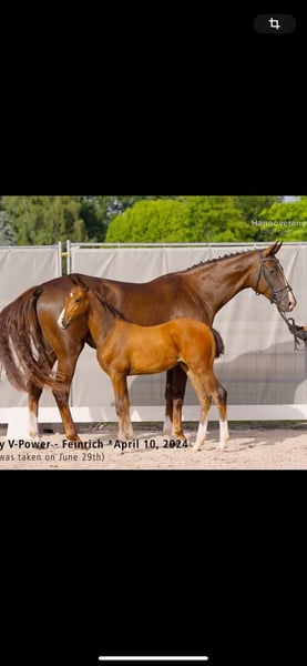 In vendita una fattrice gravida Feinrich x De Niro. È previsto un puledro dal promettente stallone V-POWER. L'anno scorso, il suo puledro VAN DANGO, anch'esso di V-POWER, ha raggiunto il prezzo massimo di 36.000 euro all'Asta Elite di Verden. Anche quest'anno ci si aspetta un puledro di prim'ordine in aprile. Vendita per ridimensionamento.