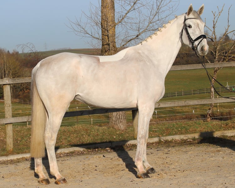This grey mare has been carefully trained and has achieved scores of over 8 in style tests. Her consistent canter and confident jump stand out. She always jumps very relaxed and securely. Additionally, she performs changes smoothly and reliably.
