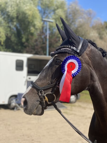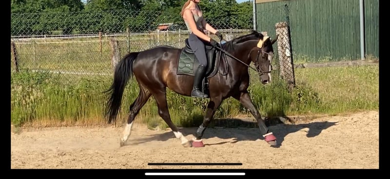 For sale is this charming small mare with a shiny black coat. She has already won at A* level and placed at A**. Jumping: Very talented, with a beautiful technique and plenty of energy. Dressage: Performs flying changes, extended trot, and more. In handling, she is very well-behaved. She does not rear or buck. She is part of the herd and socially well-adjusted. Riding alone or loading onto a trailer is no problem. She requires a confident rider for jumping, who is not afraid. Hannoverian by Stolzenberg / Graf Remus Approximate height: 16.1 hh Regular dental, osteopathic, vaccination, and farrier care. Trial ride costs €30.