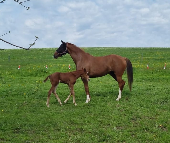 Vendesi a causa di esigenze di allevamento: Bellissima fattrice rossa da BENICIO x WATERFORD, altezza 166 cm, con un puledro maschio nato nel maggio 2025 da ESCANTO PS. Addestrata a livello di S (squadra di dressage), con brevetto SLP, successivamente montata solo sporadicamente poiché ancora in fase di svezzamento. Addestramento svolto da amazzone di livello S, con brevetto SLP; successivamente montata solo occasionalmente. Fratello completo della madre, vincitore in dressage a livello S! Stalla molto tranquilla, socievole e molto affettuosa con le persone, anche molto semplice con i puledri. Origine della famiglia SCHLIESSERIN, una delle migliori linee di fattrici Hannoverane! Nessun problema di salute o difetti comportamentali noti, cresciuta fin da puledra nel mio allevamento. Ha vissuto in paddock all'aperto, ma conosce anche box e pascolo notturno e diurno. Montata per la prima volta all'età di 4,5 anni a causa della mancanza di cavalieri, poi a 5 anni in addestramento, senza aver mai dato problemi. L'AKU (esame veterinario) può essere effettuato a spese dell'acquirente. Ha avuto due puledri, entrambi da ESCANTO PS, rispettivamente nel 2023 e nel 2025; non è stata coperta nel 2026. Il puledro del 2025 è già stato venduto e sarà ceduto a metà novembre. Altre clip di video di monta disponibili. Per qualsiasi domanda, non esitate a contattarmi.