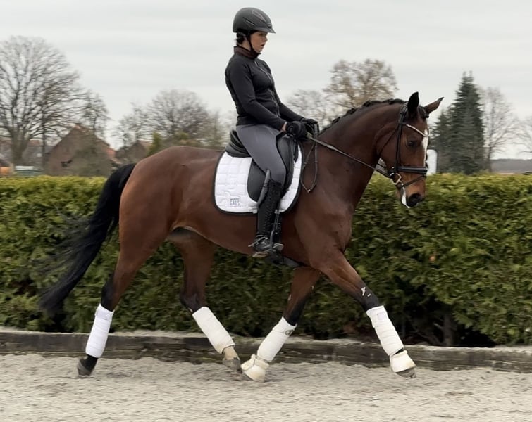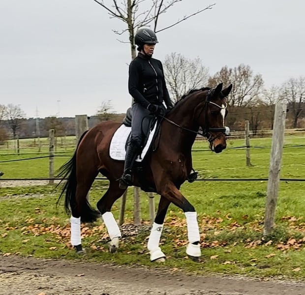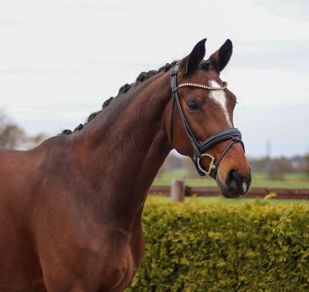 This beautiful bay mare was foaled in 2018 and impresses with her attractive appearance and pleasant temperament. Standing at 16.1 hh, she is the perfect size as a ladies' or junior riding horse. She is solidly trained up to L-level and has achieved placings in A-level dressage competitions. In trot, Floor consistently demonstrates rhythm and evenness, while in walk, she maintains excellent consistency. She has been ridden for two years by a young rider, including in the outdoor arena and on trails. Floor has always been healthy and is being sold due to lack of time. Please feel free to contact me for further information or to arrange a viewing.