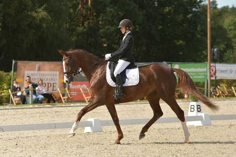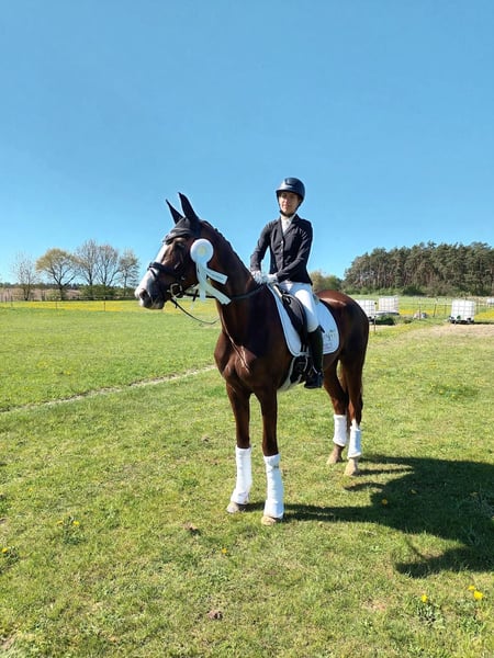We are selling our stylish 7-year-old dark chestnut mare. Quintesse is a treasure in daily handling; she is completely uncomplicated with the farrier, trailer loading, trail rides, and jumping small courses. Last year she won a dressage A competition and is currently winning dressage L competitions. Due to a clinical finding on her back, which does not cause her any problems, she is being sold at a favorable price. If interested, I would be happy to send the veterinary examination report.