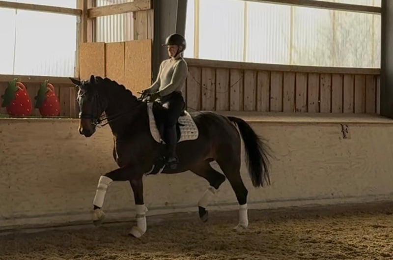 Diese hochelegante, moderne Nachwuchsstute überzeugt mit herausragender Qualität im Trab, viel natürlichem Schwung, sehr gutem Untertreten und bester Balance. Der Galopp zeigt sich bergauf gesprungen, ausbalanciert und durch den Körper springend. Der Schritt ist taktsicher, losgelassen, raumgreifend und mit schöner Schulterfreiheit ausgestattet. Die Stute ist gelehrig und zeigt sich im täglichen Training aufmerksam, motiviert und stets bemüht, ihrem Reiter zu gefallen. Sie ist fein zu reiten und reagiert sensibel auf die Hilfen, weshalb wir uns einen einfühlsamen, bereits etwas erfahrenen Reiter wünschen, der Freude an der Ausbildung junger Pferde hat. Im Umgang wie unter dem Sattel zeigt sie sich unerschrocken, weder geräuschempfindlich noch bodenscheu und bleibt dabei stets klar im Kopf. Sie achtet sehr auf ihren Reiter, reagiert fein auf Hilfen und freut sich sichtbar über jede Form von Lob. Mit ihrer Leistungsbereitschaft, ihrer hohen Grundqualität und ihrem eleganten Wesen bringt sie beste Voraussetzungen mit, um bei behutsamer und gefühlvoller Förderung eine erfolgreiche Zukunft in der Dressurausbildung zu haben. Standort des Pferdes ist Rosenheim. Bei Rückfragen können Sie sich sehr gerne telefonisch oder per WhatsApp bei uns melden. Für das Probereiten des Pferdes wird eine Gebühr von 30,- € berechnet. Selbstverständlich wird Ihnen die Gebühr für das Probe reiten (bei dem Sie auch sehr fachkundigen Reitunterricht bekommen) zurück erstattet.