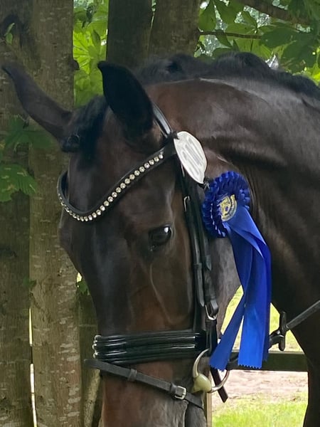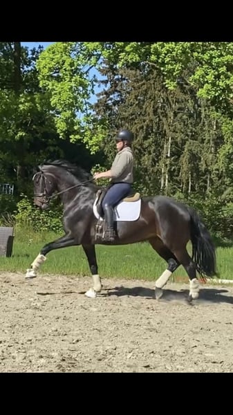 Farfalla, a 6-year-old mare, is the riders' absolute favorite. Home-bred by us, lovingly broken in and built up with care, she is confident at elementary level, is soft to the ground and responds very well to the rider's aids. With her three very good basic gaits, she is an absolute reliable horse in any arena. She enjoys her daily work and gives the rider a good feeling. Her sire Franz Ferdinand is a full brother of the 2013 and 2014 World Champion for Young Dressage Horses Woodlander Farouche. Devalero, the dam's full brother, has won over ten advanced (S) level dressage competitions. Her uncomplicated nature also makes her the ideal horse for ambitious young riders. X-rays available. Videos available on request via WhatsApp.