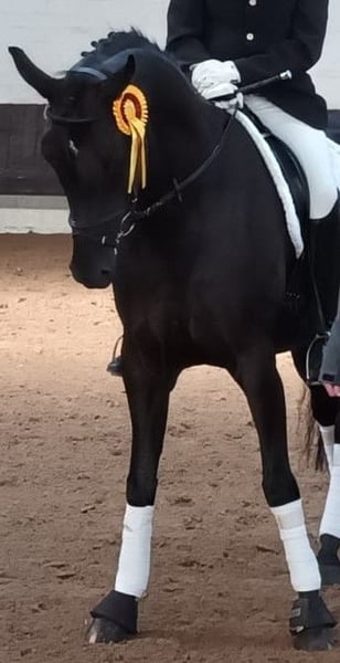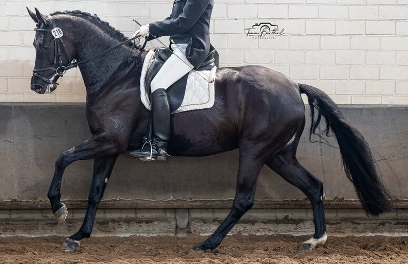 **Sales Advertisement: Beautiful Hanoverian Mare for Sale** For sale is an impressive Hanoverian mare, born in 2018. This elegant black mare captivates not only with her striking color but also with her friendly disposition and versatile talents. **Features:** - **Breed:** Hanoverian - **Gender:** Mare - **Year of Birth:** 2018 - **Color:** Black - **Height:** 172 cm The mare already shows promising progress in her training and has the potential for both competition and recreational riding. She is well-mannered, well-ridden, and suitable for both experienced riders and ambitious beginners. She is healthy, regularly vaccinated, and dewormed. If you are interested or have any further questions, please feel free to contact me. Visit us and see for yourself this wonderful mare! Placings: Dr. Pf. A 2x 2nd place, 2x 3rd place, 2x 5th place Dr. Pf. L 1x 3rd place Dr. L won with a score of 8.0 was successful both outdoors and in the arena, a horse for the big rectangle on the way to Dr. Pf. M. very nice traverses, already quite secure changes The mother is a state premium mare with many sporting successes up to S level in dressage. In her mare performance test, she received a score of 9 twice for her rideability, which she has also passed on to her daughter, mare line in Hanover of Shocolata, like Don MARTILLO.