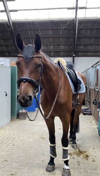 Soraya“ ist eine 8 jährige Hannoveraner Stute von Stolzenberg x Graf Top. Sie ist ca 175cm groß. Sie befindet sich aktuell im Prozess des Antrainierens nach einer 2 jährigen Fohlenpause. Sie wird bereits wieder regelmäßig dressurmäßig gearbeitet, unter dem Reiter gesprungen und geht regelmäßig ausreiten. Um auf dem Turnier zu starten, braucht sie jedoch noch ein bisschen mehr Routine. Sie ist im Umgang und beim Reiten brav und unerschrocken und auch beim Springen immer entspannt und läuft nicht am Sprung vorbei oder ähnliches. Sie hat ordentlich Vermögen am Sprung und ist sehr vorsichtig und geschickt beim Springen, sodass sie sicherlich mit ein wenig Ausbildung auch bis in die höheren Klassen starten kann. Auch beim Springen von Geländehindernissen hat sie bereits Erfahrung gesammelt. Bisher hat sie noch keine Turniererfahrung. Sie brachte 2025 ein Fohlen auf die Welt, welches als Goldprämienfohlen prämiert wurde. Sie nahm sofort beim ersten Mal besamen auf und sowohl die Geburt, als auch die Zeit mit dem Fohlen verliefen reibungslos. Sie ist selbst im Hannoveraner Hauptstutbuch als Zuchtstute eingetragen, weshalb sie auch für die Zucht interessant ist. Bei Interesse oder Fragen, melden Sie sich doch gerne bei mir. Laleh Alimoradian 015228924592