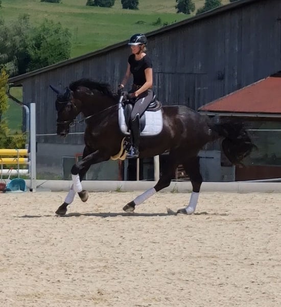 For sale is the 8-year-old Hanoverian black mare Florence – a true gem for riders looking to combine athletic ambition with a reliable partner. ✨ Character & Handling: Florence is an exceptionally brave, people-oriented, and uncomplicated mare – absolutely dependable in daily handling, with the farrier, loading, or in the arena. She consistently shows cooperation and strong nerves. Training: Florence is solidly trained and already confidently masters many dressage movements. She demonstrates beautiful lateral movements, reliable flying changes, and is currently ridden at M-level – with further potential for advancement. Her clear movement pattern, rideability, and eagerness to work make her an ideal partner for ambitious dressage riders. In addition to the dressage arena, Florence also impresses in leisure riding with her calmness and joy in working together. ✅ Additional Information: Large-framed with an elegant presence Healthy, sturdy build Regularly seen by the veterinarian, dentist, and farrier Older X-rays available Accustomed to box housing with plenty of turnout and a walking machine Trial rides are welcome by appointment. Florence looks forward to a loving home with a sporting perspective! The owner places great importance on Florence going to the best hands. A place is sought where she will not only be further developed in riding but also valued as a partner and integrated into everyday life. A loving home with prospects is her top priority.