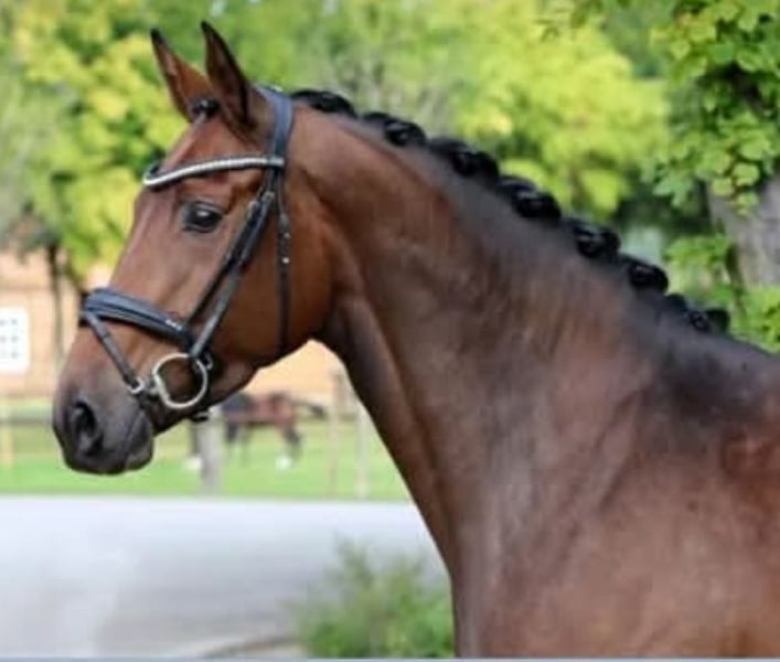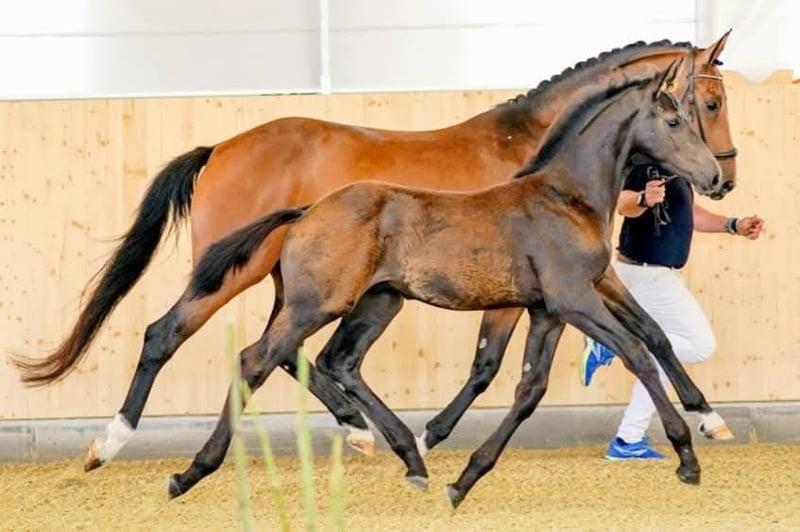 Highly rideable mare by Borsalino, can be ridden again at any time. Excellent TÜV (2021 auction), PSSM2 negative. In foal for May 2026 to top sire Bonds (S success, Bonds is the current champion stallion of the Oldenburg licensing). Due to her offspring (twice awarded OL premium foals by Black or White Bordeaux and For Dance), she is placed in a top position. A fantastic mother, she gains weight easily and foals uncomplicatedly. Registered with Oldenburg and Austria.