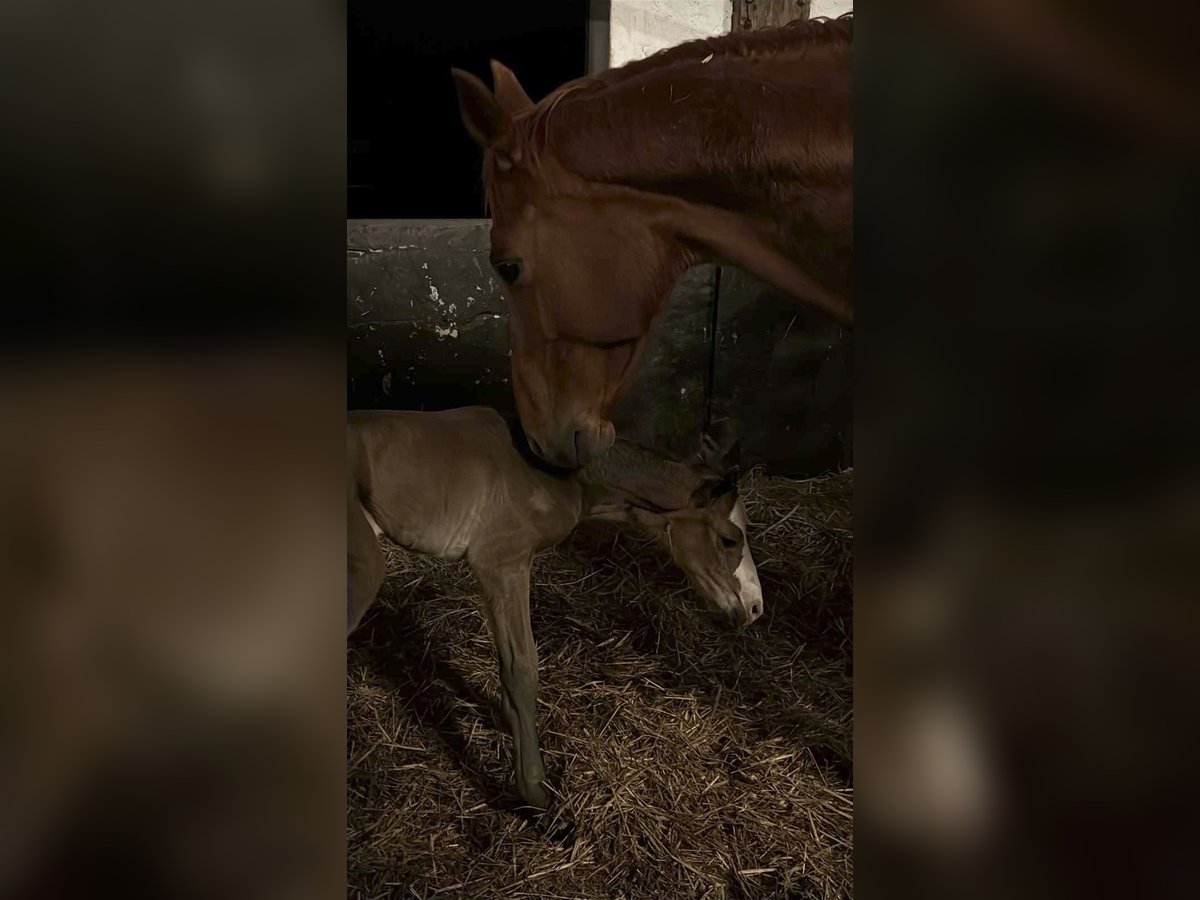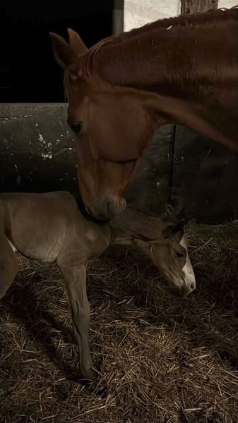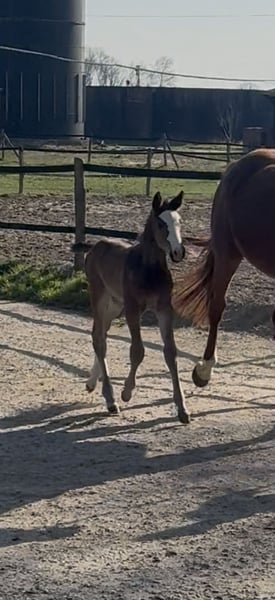 Hannoverian mare, born in 2026, with a lot of presence and a distinctive appearance, correct conformation, and a friendly, affectionate nature that is very people-oriented. She is available to move on at the end of the year if desired. Just a few days old, she already shows great curiosity, playfulness, and fearlessness, with beautiful, elastic, and flowing movement.