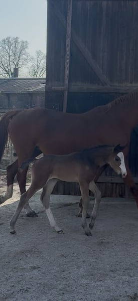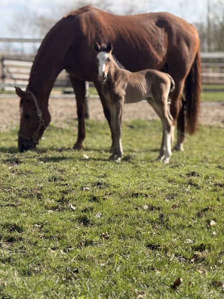 Hannoveraner Stute, geb. 2026, mit viel Ausstrahlung/typvoller Erscheinung, korrektem Fundament und dem Menschen zugewandtes, liebes Wesen, darf zum Ende des Jahres, wenn gewünscht - ausziehen. Erst ein paar Tage alt, zeigt sie sich bereits sehr neugierig, verspielt und unerschrocken mit schönen, elastisch/schwingenden Bewegungsabläufen.