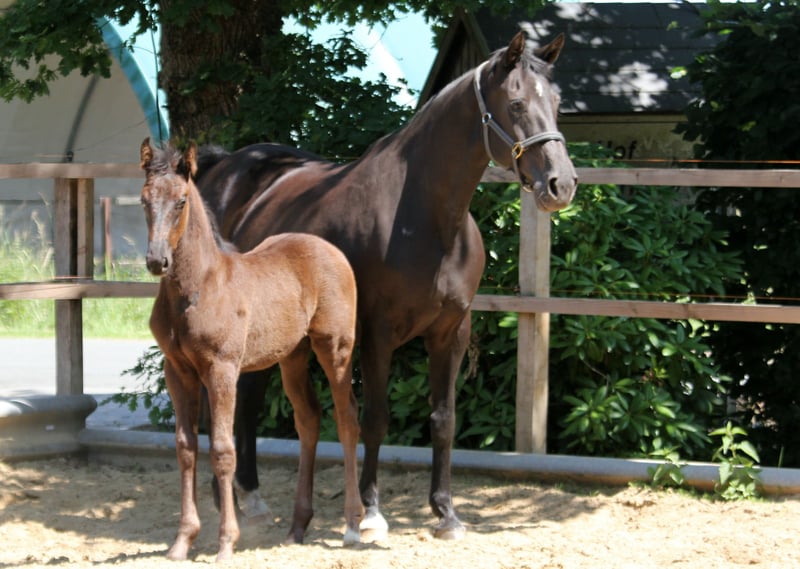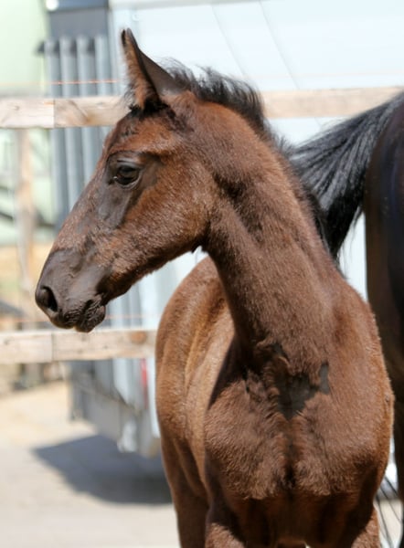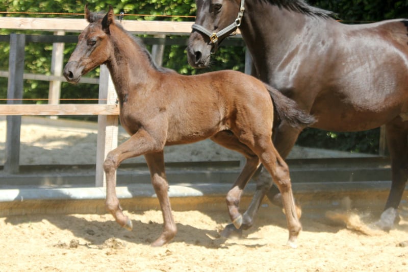 Potente semental negro del año de estreno de Leclerc. Estable y correcto en su estructura. Con sus movimientos poderosos y enérgicos, sabe impresionar desde el primer momento. Esto también está programado genéticamente: el padre Leclerc es hijo del segundo clasificado del Nürnberger Burgpokal 2023, Lord Europe, y por lo tanto nieto del padre Glamourdale, Lord Leatherdale. La madre de Leclerc, la St. Pr. y El. St. Weihronce, también es madre de Viva Gold, que recientemente ha estado en las noticias bajo la monta de Isabell Werth. Su abuela no es otra que la excepcional yegua Weihegold, que disfruta de una característica única a nivel mundial en la combinación de rendimiento deportivo y de cría. Fue campeona de Oldenburg en 2008, ganadora de la medalla de bronce en el Bundeschampionat en 2009, finalista en el Campeonato Mundial de Caballos Jóvenes en 2010, ganadora del Nürnberger Burgpokal en 2013 y ganadora de la final del Louisdor Preis en 2014. Fue campeona de Europa, campeona del mundo, medallista olímpica, tres veces ganadora de la Copa del Mundo y, por supuesto, número uno en el ranking mundial. En 2022, a los 17 años, se despidió del deporte de manera saludable y llena de energía como tercera en la final de la Copa del Mundo en Leipzig. La madre Emma de Earl - Alabaster convence con excelentes características de carácter y montabilidad. Ya ha producido varios caballos jóvenes prometedores en el deporte de formación. El padre Earl, criado para saltos, tuvo éxito hasta la categoría alta en el cuadrilátero de doma. El bisabuelo Alabaster, un verdadero noble, también produjo una serie de caballos de doma exitosos a nivel internacional. Video disponible a solicitud. Por encargo del criador. Se puede ofrecer un lugar de crianza.