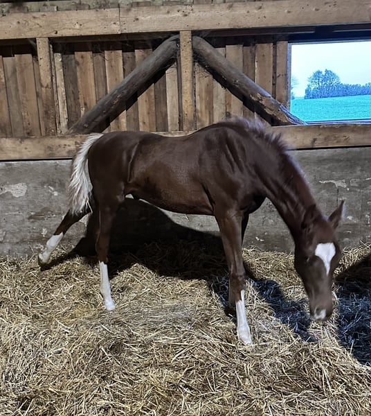 Elegant Hanoverian Stallion for Sale Discover the exceptional qualities of this stunning chestnut Hanoverian stallion, born in 2025. Standing at 172 cm, he combines impressive stature with a graceful presence. Bred for excellence in dressage, he exhibits natural talent, suppleness, and a willing temperament ideal for both competitive riding and serious training. Whether you're aiming to develop a future champion or add a distinguished horse to your stable, this promising young stallion offers a remarkable opportunity. Don't miss the chance to bring home a true embodiment of Hanoverian elegance and athleticism.
