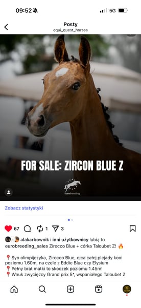 Śliczny ogierek Hannowerski po Zirocco Blue VDL . Matka to pełna siostra konia Titan 12 startującego pod polską zawodniczką do 145 cm . Matka zakupiona źrebna z renomowanej stadniny VDL w Holandii . Wychowany w grupie , przyzwyczajony do wszelkich zabiegów kosmetycznych i kowala . Przyzwyczajony do transportu i golenia . Szczepiony . Zapraszam do kontaktu w celu uzyskania dodatkowych informacji i umówienia się na oględziny. Beautiful Hannover colt by Zirocco Blue VDL. The mother is a full sister to the horse Titan 12, which competes under a Polish competitor up to 145 cm. The mother purchased the foal from the renowned VDL stud in the Netherlands. Raised in a group, accustomed to all cosmetic and blacksmith treatments. Used to transport and shaving. Vaccinated. Please contact me for additional information and to arrange an inspection.