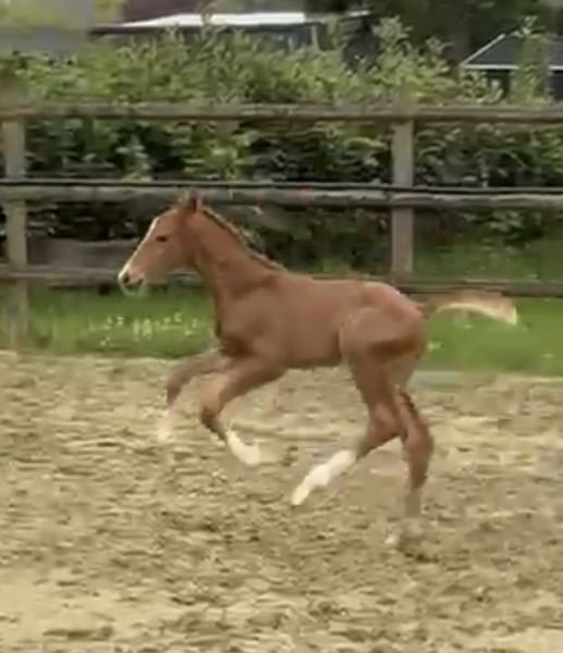 Der kleine Sohn von Bon Esprit aus einer Secret x Bretano II Mutter, möchte in die Fußstapfen seiner Vorfahren. Jetzt schon mit Schwung und Elan ausgestattet, wird er sicherlich mal durch das große Viereck tanzen. Ein Dunkelfuchs mit 4x weiß und korrektem Fundament zieht die Blicke auf sich. Ggf. steht auch die Stute zum Verkauf.