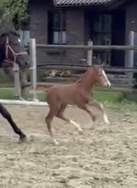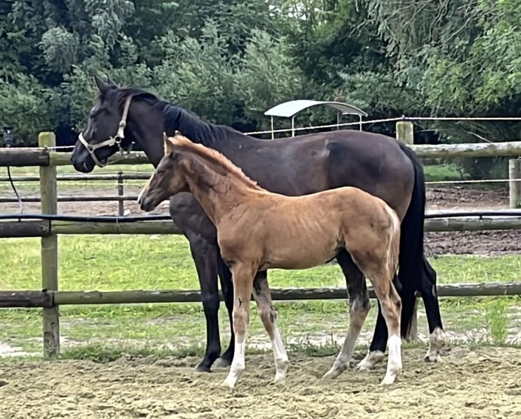 The little son of Bon Esprit out of a Secret x Bretano II mother wants to follow in the footsteps of his ancestors. Already equipped with momentum and energy, he will surely dance through the big arena one day. A dark bay with 4 white markings and correct conformation draws attention. The mare may also be for sale.