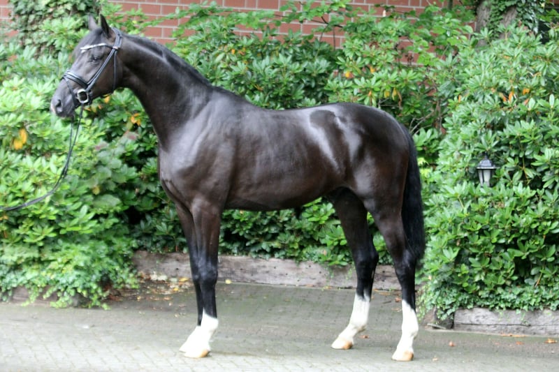 This sympathetic black horse immediately impresses with its four white socks. Its movement is also exceptional and leaves nothing to be desired. With an excellent attitude, there is nothing standing in the way of a promising career under saddle. That these qualities are not coincidental is revealed by a look at its pedigree. Sire Secret is already considered an exceptional horse with an unprecedented breeding record. At the World Championship for Young Dressage Horses in Ermelo 2024, Secret has 15 participants, 10 of which are in the ranking of the six-year-olds. This includes the vice-champion of the four-year-olds, the bronze medalist of the five-year-olds, and the vice-world champion of the six-year-old dressage horses. At the concurrently held Bundeschampionat, another 25 offspring of Secret competed, including numerous finalists and the vice-bundeschampion of the four-year-old mares and geldings. According to FN, the number of licensed and recognized sons has risen to 55, including many premium stallions and celebrated prize winners. Grandfather Bon Coeur impresses both with his own sporting career and that of his offspring. He was a premium stallion at his licensing, winner of his 30-day test, and a two-time vice-bundeschampion. His titles also include the Weltmeyer Prize 2018 and the Grande Prix 2023. X-rays are available. Video upon request.