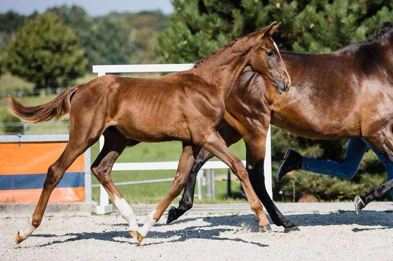 Vertigo is a son of fabulous stallion Va Bene and an amazing black mare Finchen. He is chestnut with a star on his beautiful head. He’s very typey and correct, and has long lines in his body. His movement is very dynamic and smooth, he engages his hind end well. His nature is so ingenious, he is incredibly trusting and people-oriented. He wants to work with people and you can see he enjoys it. Vertigo’s father, chestnut Va Bene, is a grandson of a famous Vitalis, known for incredible rideability and amazing movement, which all of his descendants inherit. Va Bene is a very relaxed horse with great mechanics, he has a huge amount of balance in all three basic gaits, which he displays in all performances under saddle. At the end of 2019, he completed a first-class 50-day test with the final score of 8.59 in Schlieckau and is now tested for life. His character showed a great willingness to perform and gave a strong overall impression, he received the grade 9.0. In an impressive year he was ranked second with the rideability 9.25. Va Bene was already victorious in ridden horse tests with top marks (including 9.5 for the canter). In 2021, Va Bene celebrated remarkable sporting successes! He was able to qualify for the 2nd World Championships in Warendorf and immediately for the Bundeschampionat.