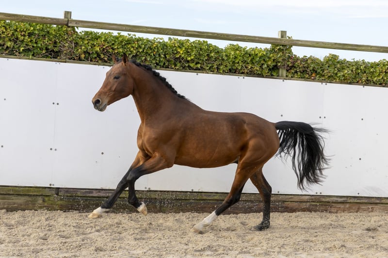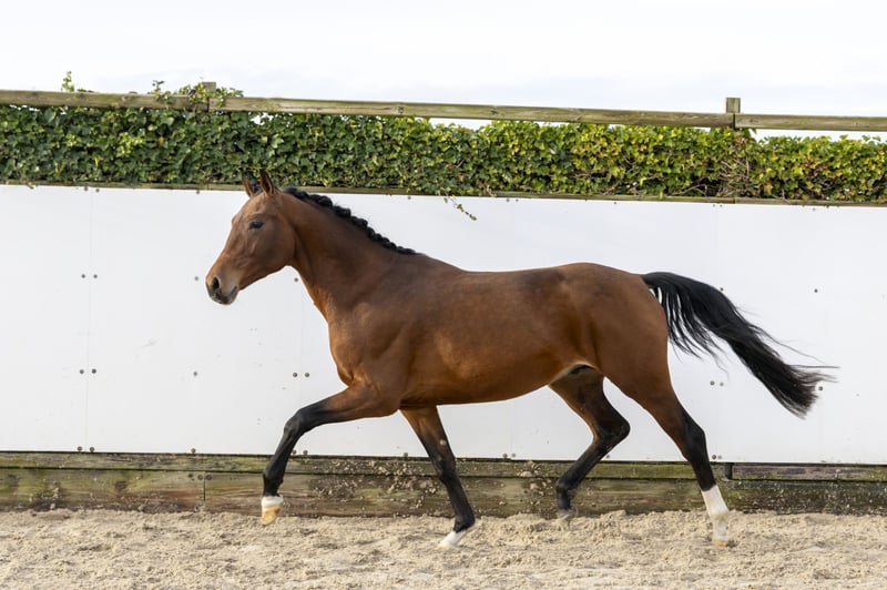 Di Caprio is a modern dressage horse with a well-lined model and a clear uphill build. He stands out for his presence and correct conformation. In movement he shows a very good trot, with a lot of lightness and a quick, active and carrying hind leg. He moves smoothly through his body and demonstrates natural balance and suppleness. In the basic gaits, Di Caprio presents himself in a harmonious and easy way. His movement is light and expressive, making him interesting for riders who are looking for quality in movement. Thanks to his body use and carrying power, he is very suitable for further training towards the higher levels of dressage. Sire Despacito (Don Nobless x Dancier) is approved by the Hanoverian studbook and competes himself at S-level dressage. He carries the blood of Don Nobless, who competed at Grand Prix level, and Dancier, known for passing on rideability and technique up to PSG / Inter I. This sire line is known for producing modern, light-footed dressage horses with a good mentality. Dam Ronja (Rascalino x Rotspon) comes from a strong Hanoverian dressage family. Through Rascalino, this line brings expression, quality basic gaits and clear talent for the sport. This damline has produced several horses successful in both sport and breeding. Second dam Anuschka (Alpenkoenig) is a State Premium and Elite mare and forms a solid foundation within this family. She produced horses with correct conformation, reliability and clear aptitude for dressage. The further damline traces back to classical German dressage lines, where durability, mentality and correct movement are key. A family known for producing functional and honest dressage horses. Di Caprio combines a modern model, strong basic gaits and a pedigree fully focused on dressage performance. An interesting prospect for riders who want to invest in quality and further development.