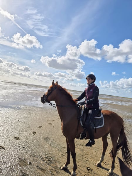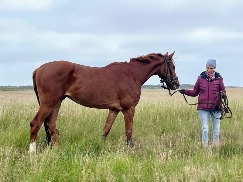 Levin (4 Jahre, ca. 1,66 m, Livaldon x Franz Ferdinand/Fürst Heinrich) ist ein dressurbetonter Fuchswallach mit schwungvollen und raumgreifenden Grundgangarten. Er ist sympathisch, menschenbezogen und bereits recht klar im Kopf. Levin ist altersgerecht und schonend angeritten und kennt auch den Strand von St. Peter-Ording – somit ist er für den gehobenen Freizeitreiter ebenfalls gut geeignet. Da ich aus gesundheitlichen Gründen länger ausfallen werde, kann ich ihm aktuell nicht so gerecht werden, wie er es verdient – gerade mit Blick auf den Winter. Er hat durch eine Weideverletzung als Jährling eine Narbe an einem Hinterbein behalten, die laut Züchterin fachgerecht versorgt wurde und ihn in keiner Weise einschränkt. Ich wünsche mir für dieses tolle Pferd liebevolle und fördernde Hände. Mit weiterer, liebevoller Winterarbeit wird Levin bereit sein, in der kommenden Saison richtig durchzustarten. Bei ernsthaftem Interesse freue ich mich über eine Nachricht per Mail!