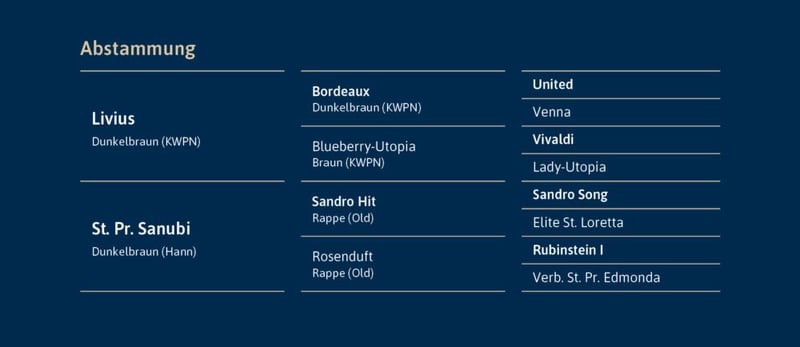 von Livius – Sandro Hit gekört für Hannover und Oldenburg, weitere auf Anfrage WFFS-frei Röntgenprotokoll unter www.hof-thelker.de Züchter: Peter Jan Schlüschen Decktaxe Frischsamen: 300 € bei Besamung + 500 € bei Trächtigkeit (zzgl. USt.) Jungzüchterrabatt! Züchtern bis 30 Jahre gewähren wir 30% Rabatt! Weitere Informationen bei Christian Thelker +49 175-854 3529 oder Karl-Heinz Hooghoff +49 170 4450576 Der Dressursport wurde ihm in die Wiege gelegt! Der Vater HLP-Sieger, die Mutter Grand Prix erfolgreich! Mit jugendlichem Charme und enormer Leichtfüßigkeit kann er selbst in allen drei Grundgangarten überzeugen. Livius – der Vater Livius, selbst sportlich hocherfolgreich bis auf Intermediär I Niveau, ist ein Sohn des Grand Prix Vererbers Bordeaux und der sporterfolgreichen Vivaldi Tochter Blueberry Utopia. Als Hengstleistungsprüfungssieger mit Höchstnoten beeindruckte er auch mit seinen ersten Jahrgängen in den Niederlanden. Sanubi – die Mutter Staatsprämien und Leistungsstute Dressur Sanubi führt über Sandro Hit und Rubinstein nicht nur bestes Dressurblut, sondern konnte am Bundeschampionat der Dressurpferde teilnehmen und war bis zum Grand Prix sportlich erfolgreich. Ihre Urgroßmutter ist keine geringere als die weltberühmte Stammbegründerin Edoste! Sie ist Gründerin dieses Oldenburger Stutenstamms und brachte mit dem mehrfachen Deutschen Meister Avignon, dem Olympia Pferd Petit Prince und Allegro Futuro gleich drei Grand Prix erfolgreiche Dressurpferde. Des Weiteren entspringen dem Stutenstamm der Edoste Pferde wie der Bundeschampion und EM-Starter Exupery, der Vize-Bundeschampion Landjuwel Gold sowie der Vererber Fürst Romancier.