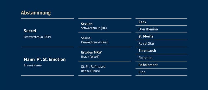 von Secret – Estobar NRW zugelassen für Oldenburg, weitere auf Anfrage WFFS-frei Röntgenprotokoll unter www.hof-thelker.de Züchter: Harald Thelker Decktaxe Frischsamen: 300 € bei Besamung + 500 € bei Trächtigkeit (zzgl. USt.) Jungzüchterrabatt! Züchtern bis 30 Jahre gewähren wir 30% Rabatt! Weitere Informationen bei Christian Thelker +49 175-854 3529 oder Karl-Heinz Hooghoff +49 170 4450576 Mit Smirnoff Ice präsentiert sich ein wahrer Musterschüler und Prototyp eines modernen Reitpferdes. Er überzeugt mit seinem kraftvollen Hinterbein und sehr gut konstruierten Fundament. Mit seinem Charme und seinem Reitkomfort zaubert er uns täglich ein Lächeln ins Gesicht. Secret – der Vater Der Vater Secret, selbst ein Sohn des dreifachen Dressurpferde-Weltmeisters und international bis Inter I siegreichen Sezuan, war Sieger seines 14-Tage-Tests, 2017 Vize-Bundeschampion, 2019 Vize-Weltmeister und 2020 Bundeschampion. Über 50 gekörte Söhne stehen zu Buche, darunter der Bundeschampion und Dressurpferde-WM-Fünfte Segantini unter Dorothee Schneider sowie der Dressurpferde-WM-Silbergewinner Alkaline/Merita Hagren/DEN und der -Bronzegewinner Severucci HT/Jeanna Hogberg/SWE. Zahlreiche weitere Reitpferdechampions bezeugen seine hohe Vererbungkraft. Emotion – die Mutter Nicht nur in ihrer Leistungsprüfung begeisterte unsere Hannoveraner Prämienstute Emotion mit hohen Rittigkeitswerten, auch im Sport konnte sie sich mit Siegen und Platzierungen vor ihrem Zuchteinsatz beweisen. Ihre Mutter Staatsprämienstute Raffinesse brachte nicht nur zahlreiche Verdener Auktionsspitzen und Reitpferde, sie ist auch Vollschwester zur Grand Prix siegreichen Rochee unter Rudolf Zeilinger sowie Halbschwester zum gekörten Rubinstar (HLP-Sieger). Mit ihren Töchtern Dynamik und Sympathie stellte sie 2013 die Reservesieger Familie der Herwart von der Decken -Schau. Als Großmutter von Escari (v. Escolar) stellte sie bereits einen Bronzemedaillen Gewinner bei den Europameisterschaften im Parasport. Mit dem Stamm der Hardine, der schon seit 50 Jahren auf unserem Hof gepflegt wird, konnten wir schon zahlreiche Erfolge feiern. Aus ihm entspringen auch die Hannoveraner Reservesiegerstute Soraya, die bis Inter I erfolgreichen Dressurpferde Ferrero und Dark Rouge sowie etliche weitere.