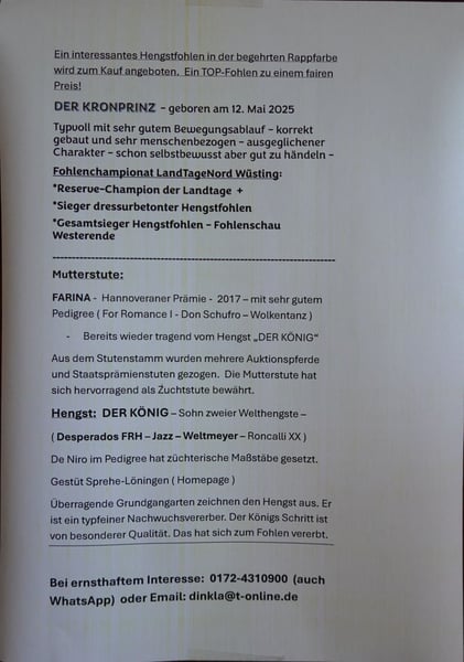 Ein TOP-Fohlen zu einem fairen Preis - das ist eine gute Chance! Ein interessantes Hengstfohlen in der begehrten Rappfarbe wird zum Kauf angeboten. Preis: Verhandlungssache (VS) DER KRONPRINZ - geboren am 12. Mai 2025 Typvoll mit sehr gutem Bewegungsablauf - korrekt gebaut und sehr menschenbezogen - ausgeglichener Charakter - schon selbstbewusst aber gut zu händeln - FOHLENCHAMPIONAT LandTageNord Wüsting : + Reservechampion der Landtage+ +Sieger dressurbetonter Hengstfohlen+ *Gesamtsieger Hengstfohlen -Fohlenschau Westerende+ Mutterstute. FARINA - Hannoveraner Prämie - 2017 - mit sehr gutem Pedigree ( For Romance - Don Schufro - Wolkentanz ) Bereits wieder tragend vom Hengst DER KÖNIG Aus dem Stutenstamm wurden mehrere Auktionspferde und Staatsprämienstuten gezogen. Die Mutterstute hat sich hervorragend als Zuchtstute bewährt. HENGST: "DER KÖNIG" - Sohn zweier Welthengste - ( Desperados FRH - Jazz - Weltmeyer - Roncalli XX ) DE NIRO hat im Pedigree züchterische Maßstäbe gesetzt. DER KÖNIG: ( Gestüt SPREHE - Löningen.) Überragende Grundgangarten zeichnen den Hengst aus. Er ist ein typfeiner Nachwuchsvererber. Der Königs Schritt ist von besonderer Qualität und hat sich zum Fohlen vererbt. Kontakt: 0172-4310900 - auch WhatsApp 04975-91020 Email: dinkla@t-online.de Video: https://youtu.be/3ZF0NBlNlVY