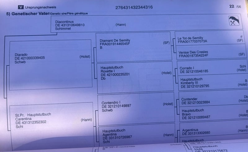 For sale: a 9-year-old, castrated Hanoverian gelding standing 1.81 m (around 16.1 hh). This horse possesses impressive conformation and sporting potential, making it ideal for an experienced rider seeking a challenge to develop him from scratch. 🧬 Exceptional bloodlines: - Sire: Diacontinus (by Diarado out of Contendro I) - Dam: Vorbuch ISH out of Lougherne Ring of Kerry (by Limerick out of White Christmas xx) High-level bloodlines featuring descendants of renowned producers such as Diamant de Semilly, Landgraf I, Contender, and Caletto II. ⚡ Current condition: Out of shape, has been inactive for a long time and lacks a basic training foundation. He requires time, consistent training, and an experienced rider. 📍 Location: Madrid
