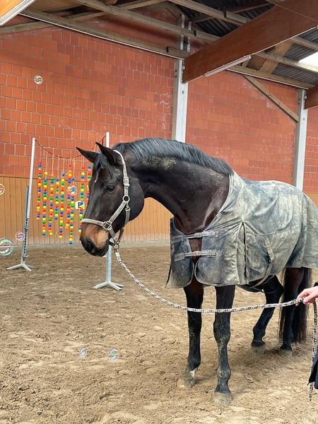 Zum Verkauf steht mein 2013 geborener Hannoveraner Wallach Hope. Er beeindruckt nicht nur durch seine Größe (1,82m), sondern besticht auch durch sein freundliches und ausgeglichenes Wesen. Er hat stets eine motivierte Arbeitseinstellung. Er ist bei mir geboren, aufgewachsen und von mir ausgebildet worden, somit ist er aus erster Hand. Er liebt es sich zu bewegen. Ob in der Dressur, an der Doppellonge, in der Boden-/Stangenarbeit oder einfach entspannt im Gelände, mit ihm ist alles möglich. Er geht sowohl alleine als auch in der Gruppe ins Gelände. Er ist bis ca. L/M Dressur ausgebildet, aber nur freizeitmäßig geritten und nicht auf dem Turnier vorgestellt. Daher eignet er sich hervorragend für den Freizeitbereich und ist der ideale Partner für entspannte Ausritte und den anspruchsvollen Freizeitreiter mit dem Schwerpunkt Dressur. Er ist nur aus Zeitgründen in allerbeste Hände zu verkaufen. Bitte keine Anfragen als Voltigierpferd.