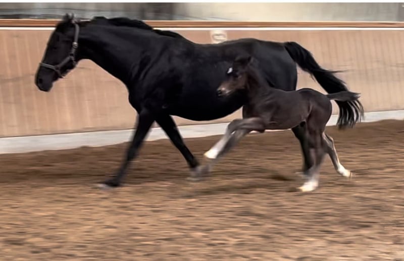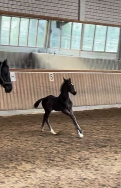 For sale is an impressive black stallion, born in 2024, with excellent pedigree and above-average basic gaits – a promising stallion candidate for breeding and high-level dressage. Born: 2024 Gender: Stallion Color: Black Pedigree: Sire: Fidelity Dam line: Bon Bravour x Wolkentanz Rearing: Species-appropriate in a herd with peers Health: Correctly developed, regularly dewormed This young black stallion has it all: modern lines, expression, excellent movement, and a balanced temperament – ideal for riders and breeders with high standards. Pedigree: Fidelity x Bon Bravour x Wolkentanz This pedigree combines modern performance genetics with proven rideability and elegance. Fidelity, a son of Fiderdance, stands for expression, light-footedness, and excellent rideability values. He impresses with typy offspring that have very good movement dynamics and a clear interior. Bon Bravour, as the maternal grandsire, brings dynamism, elasticity, and impressive movement mechanics. He has established himself internationally as a sire of performance-oriented, strong-moving horses that stand out for their shoulder freedom and carrying capacity in the hindquarters. Wolkentanz (by Weltmeyer) in the third generation rounds off the pedigree with classic dressage predisposition. He represents correctness, a solid foundation, and high rideability – traits that make his offspring valuable both in the arena and in everyday life. Conclusion: This genetic combination promises a modern dressage horse with expression, potential, and above-average movement quality – ideal for sport and breeding.